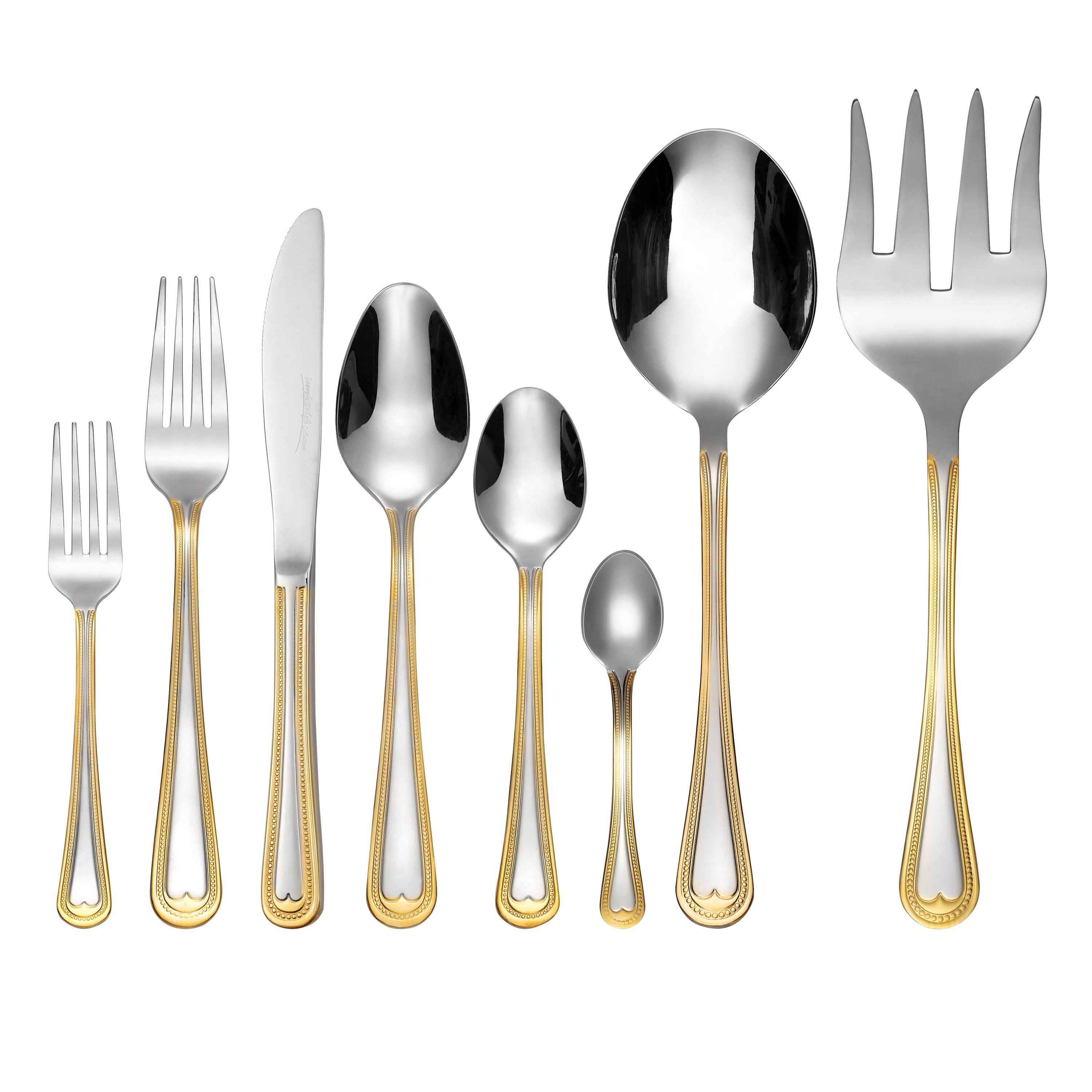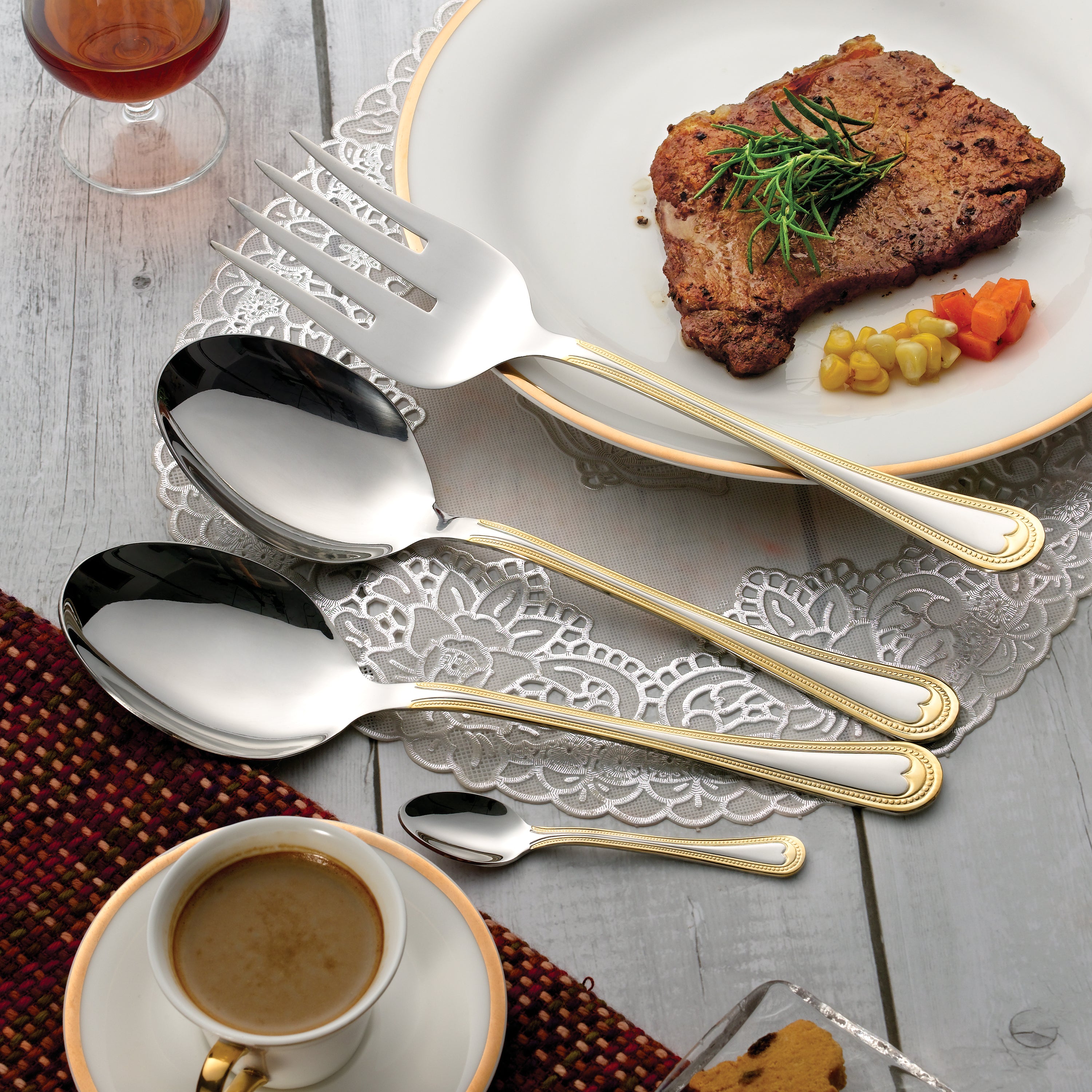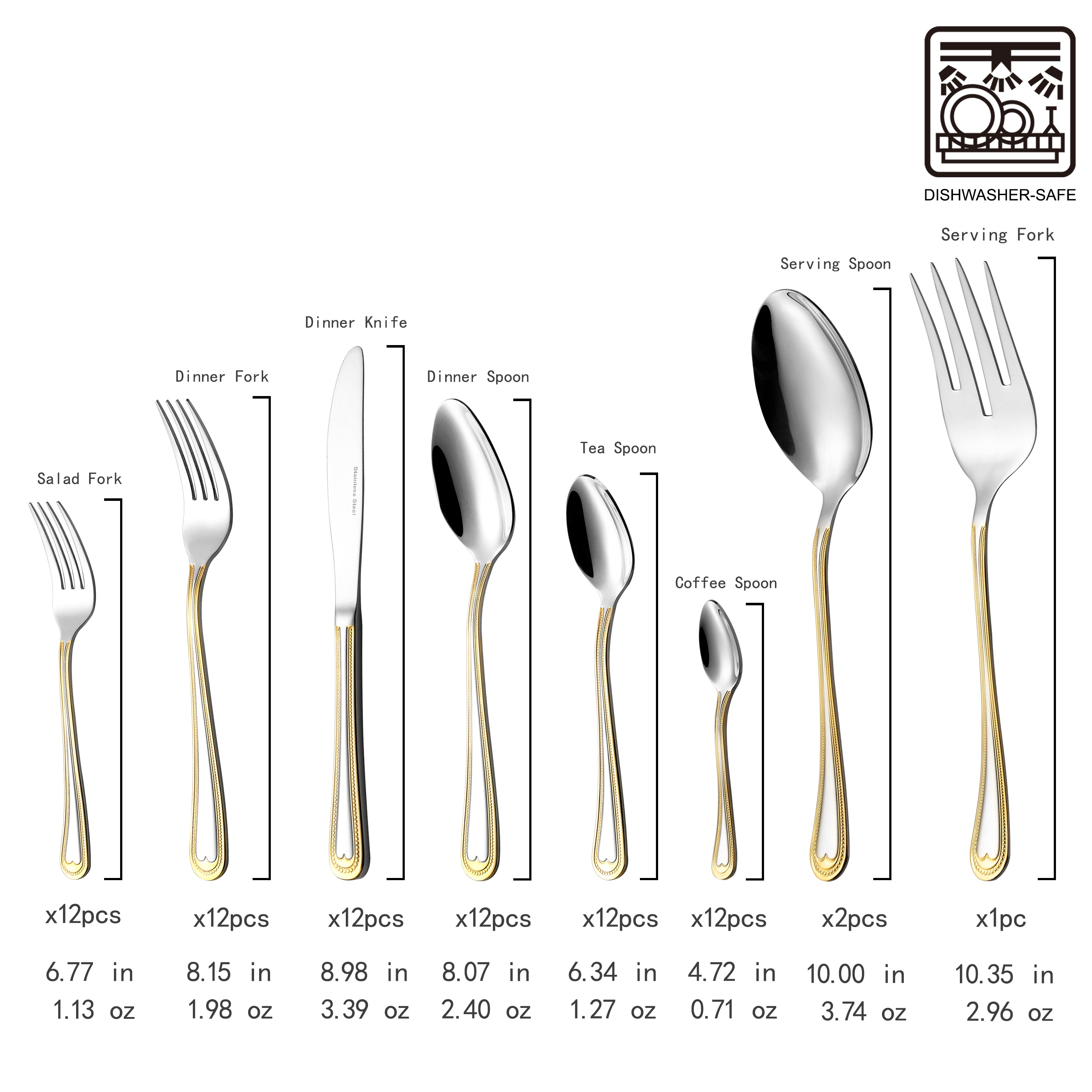 • 75 pieces total: 12 Dinner Spoons, 12 Dinner forks, 12 Dinner Knives, 12 Dessert Forks, 12 Tea Spoons, 12 Mocha Spoons 2 Serving Spoons, & 1 Serving Fork.
