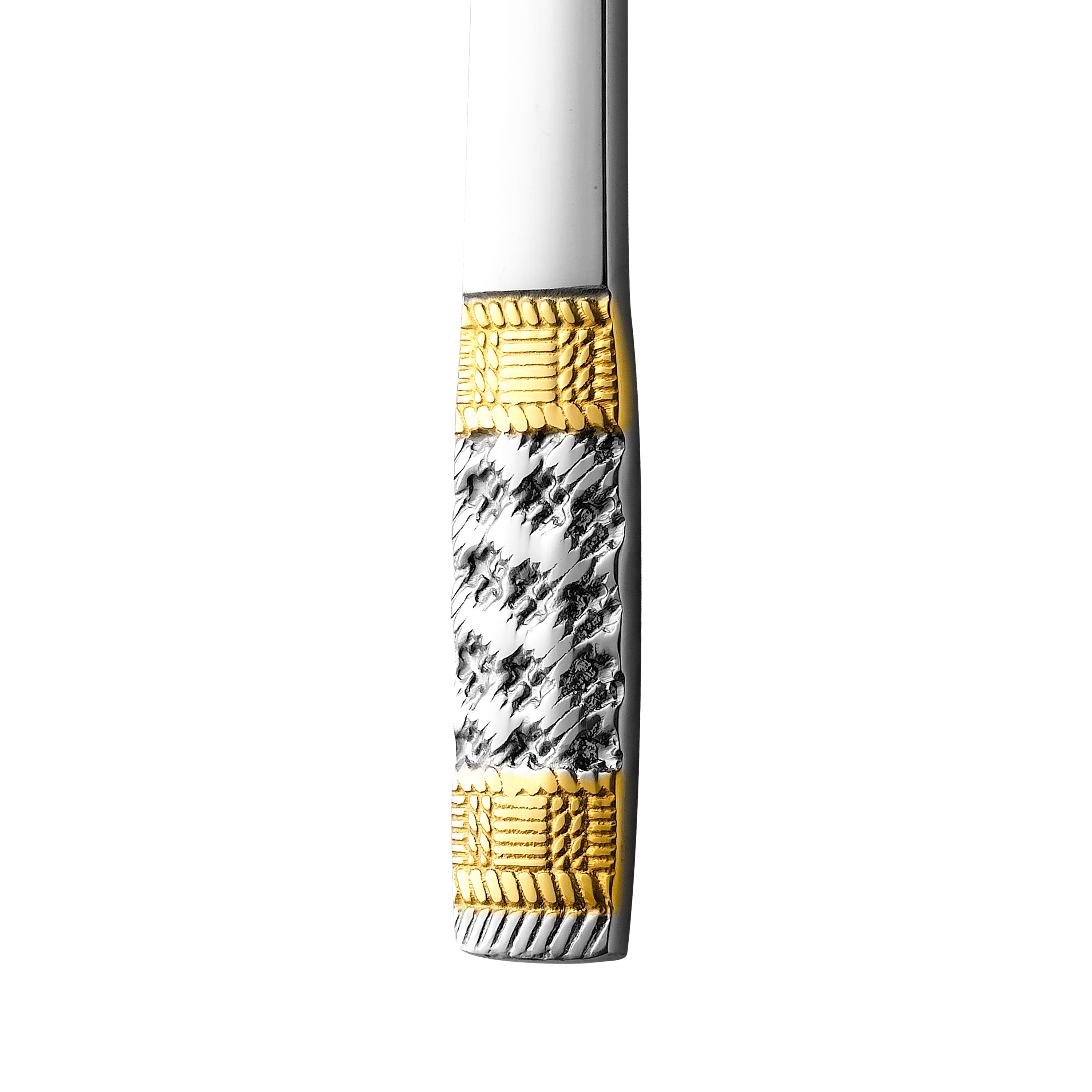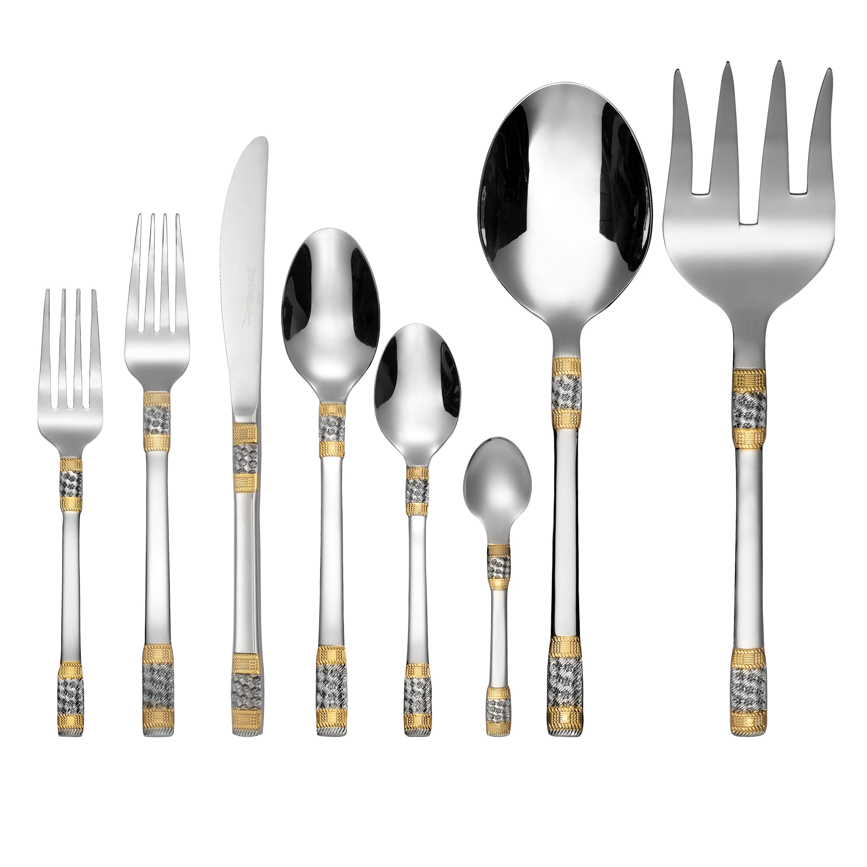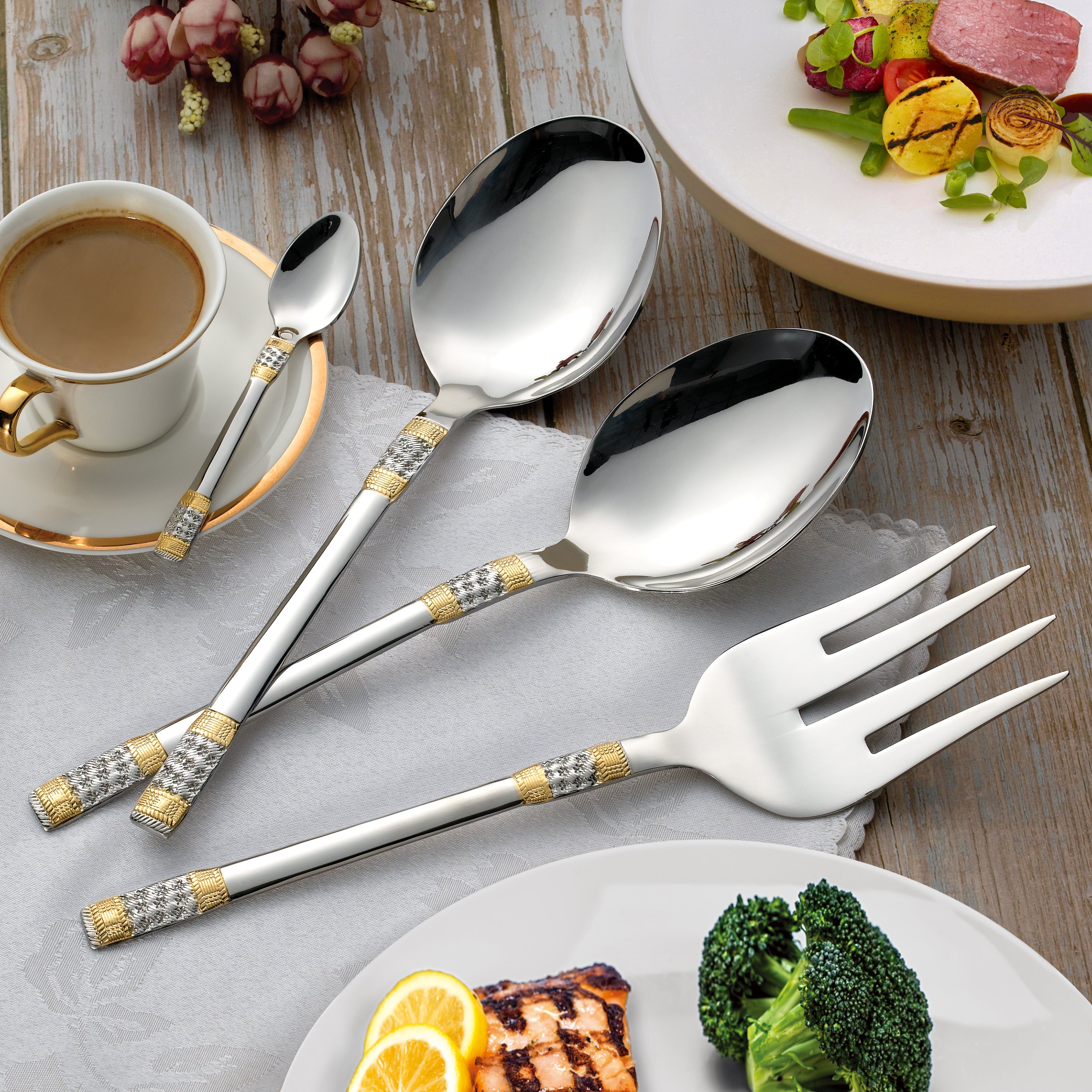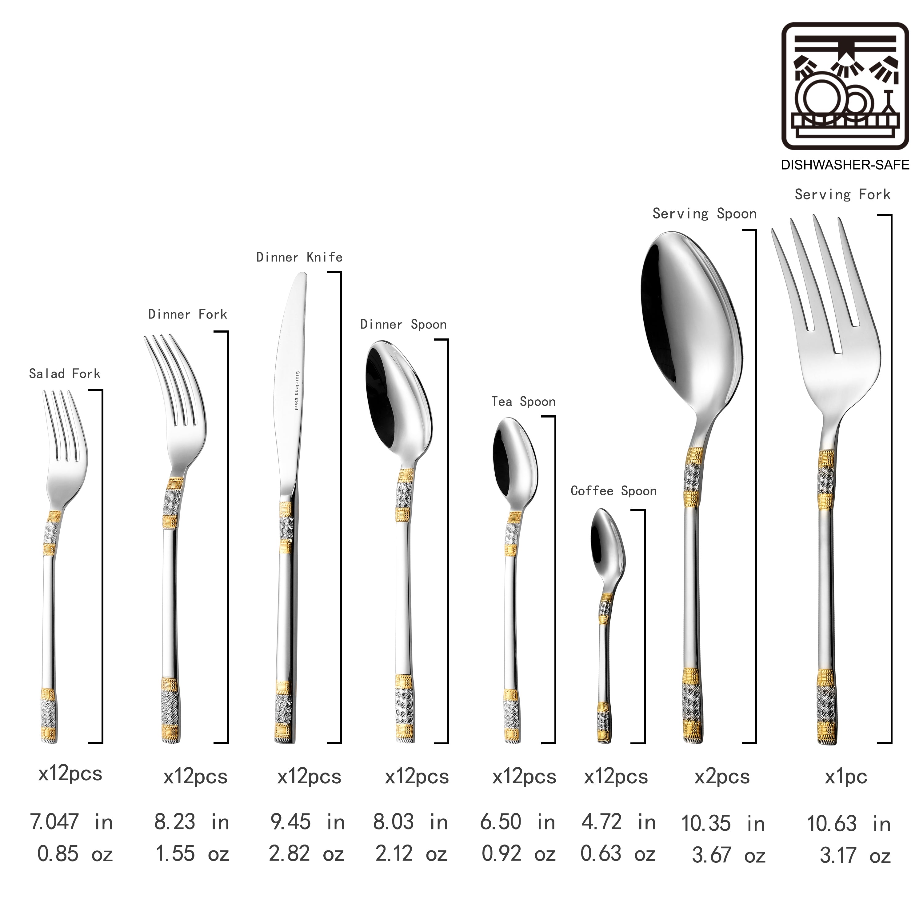 • 75 pieces total: 12 Dinner Spoons, 12 Dinner forks, 12 Dinner Knives, 12 Dessert Forks, 12 Tea Spoons, 12 Mocha Spoons 2 Serving Spoons, & 1 Serving Fork.